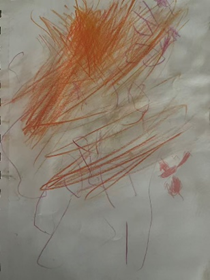 In a later drawing ritual, the children talked again about strong animals. One child drew a dinosaur, while another child drew mountains beside it.
