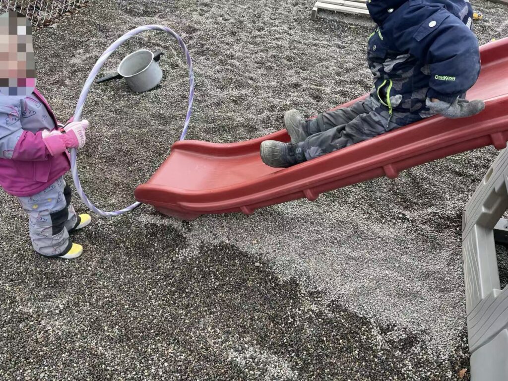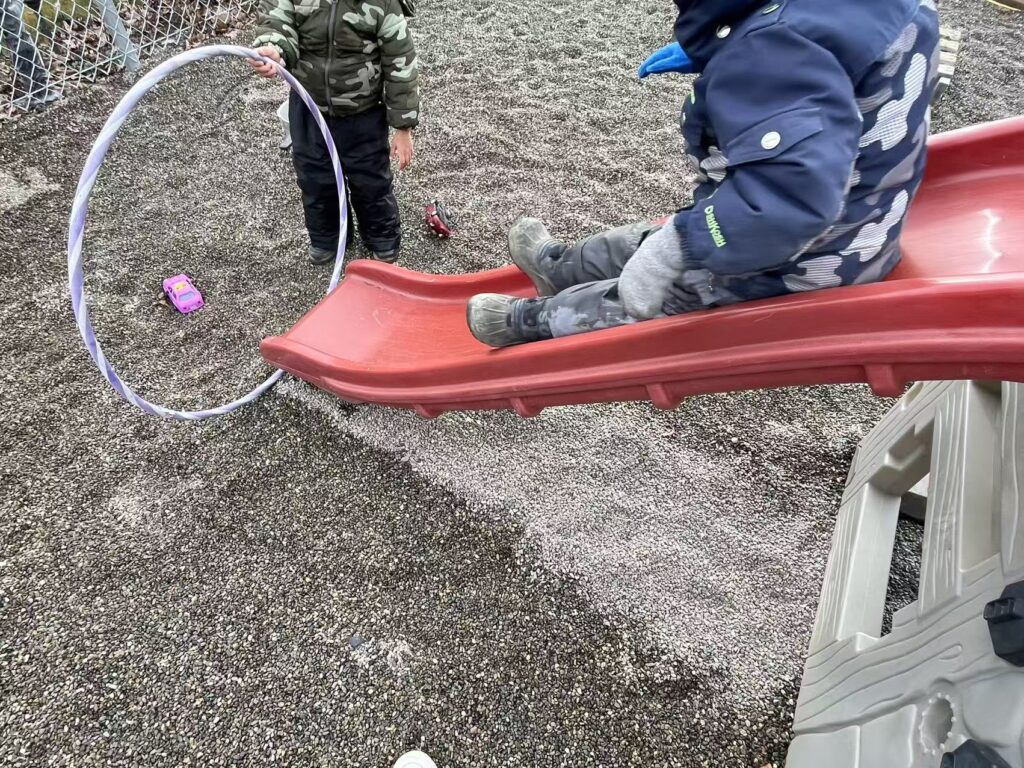 This week also included several moments of relationship-building and social learning. During outdoor play, I organized a slide game with children. We negotiated the order of turns and decided who would be the “leader” holding the hula hoop at the end. In another situation, one child found a coin, and another child wanted it. I supported them to talk and negotiate a sharing plan. Later, the child wanted to find “his own coin,” so I searched with him. Afterward, we drew the child’s “dream coin” in my notebook to extend the idea.