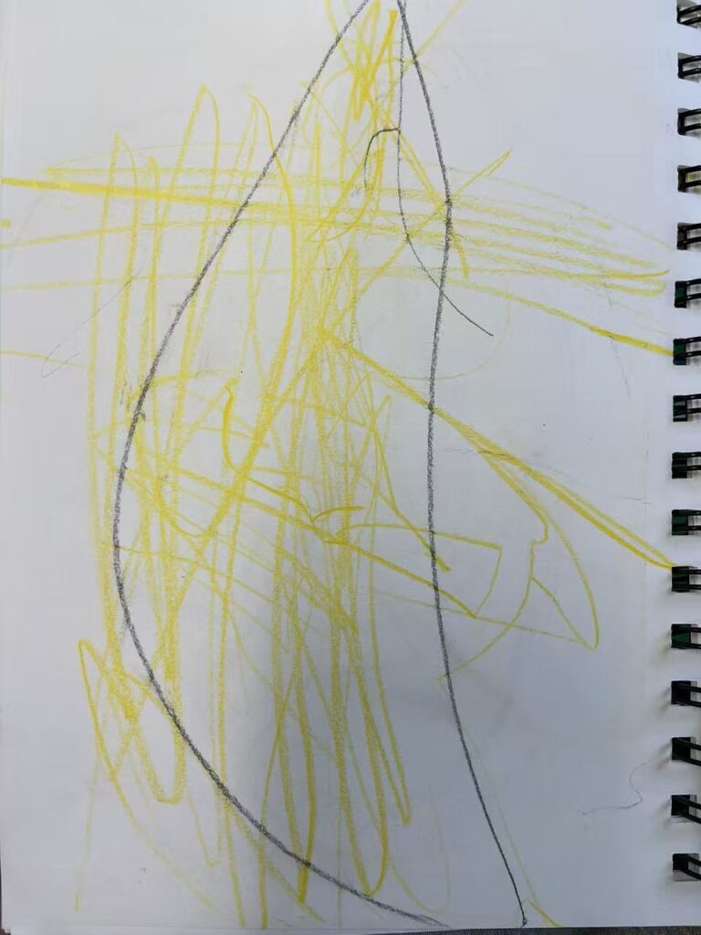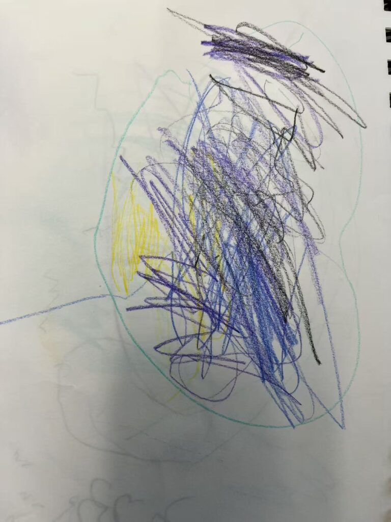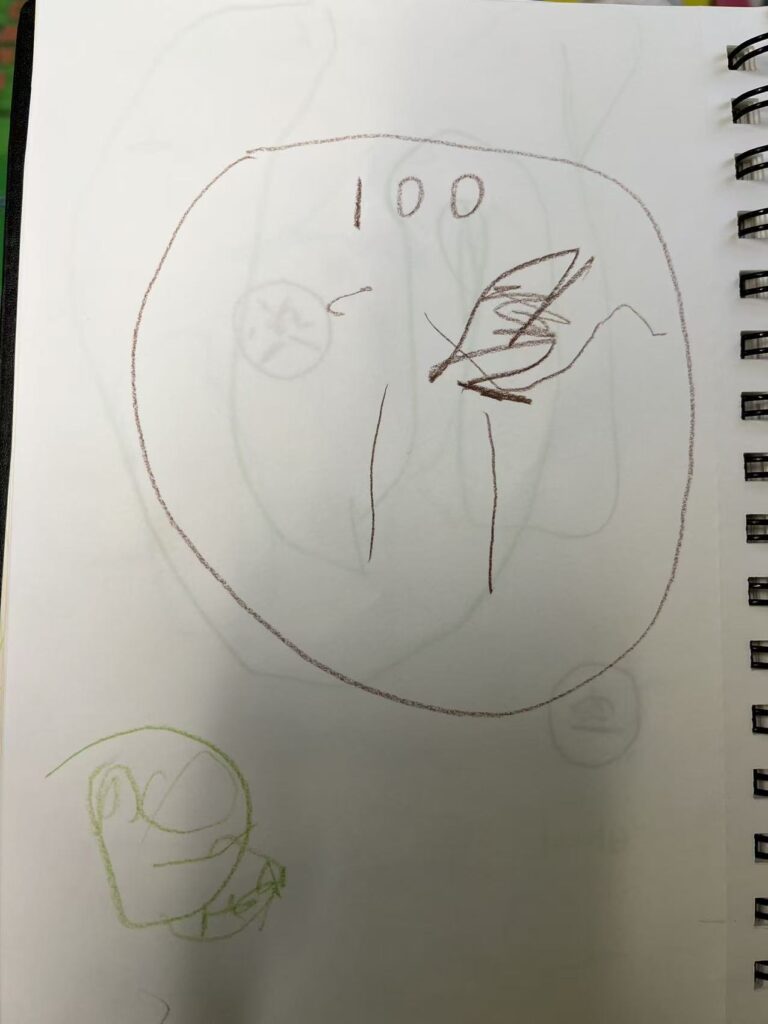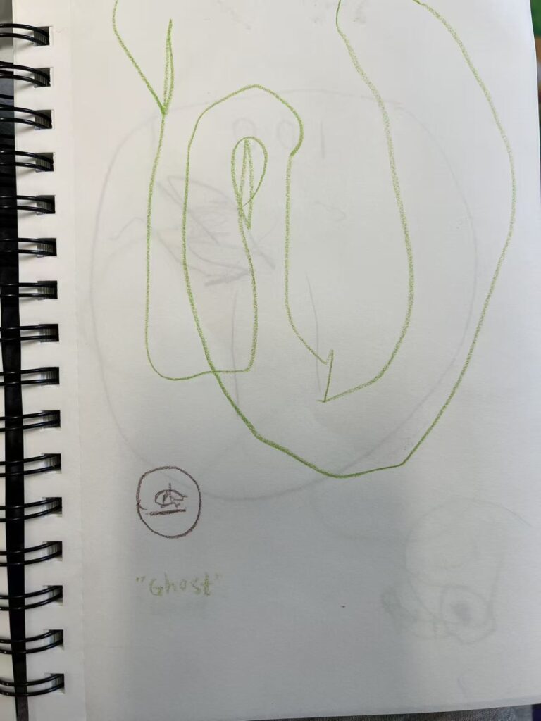 I also noticed a new interest emerging naturally. During an indoor-to-outdoor transition, two children talked about “ghost.” Later outside, another child pointed to a rock and said it was a “ghost.” Instead of redirecting the topic, I invited children to explore what a ghost might look like through drawing. Children created different representations (for example, a large circle shape, or a long thin body). I saw this as children expressing their own theories.