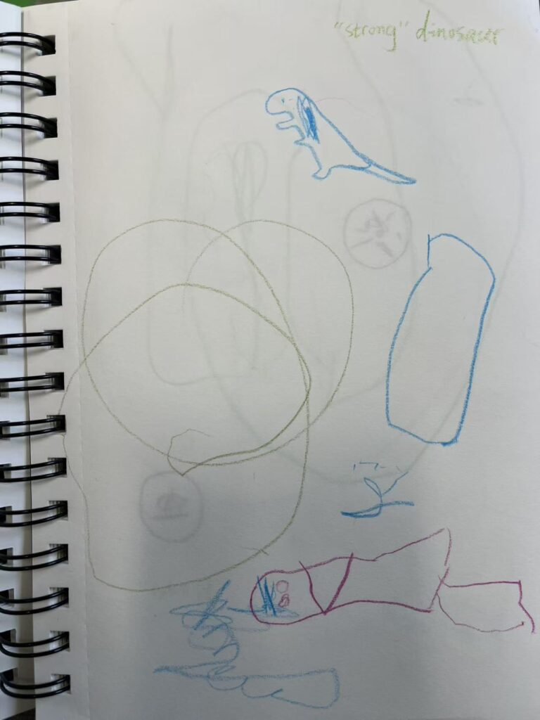 Through observation and conversation, I noticed that children frequently used the concept of “strong” during dinosaur play. I brought this idea into the drawing ritual and asked, “What makes a dinosaur strong?” Children drew sharp teeth and explained that being taller means being stronger, that having a longer tail makes you stronger, and that humans are weaker because they are smaller. These responses showed me that children are constructing their own working theories in order to understand the world.