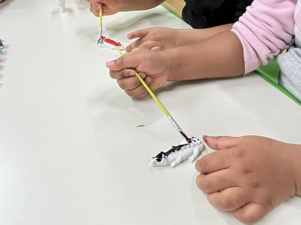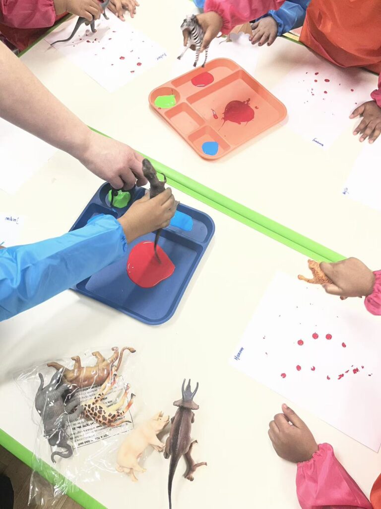 As we explored the footprints together, children began to notice that different animals have very different sizes of footprints. We talked about how dinosaur footprints might be much bigger than other animals. One child pointed to a large footprint and said, “This one is big like a T-rex.” Another child compared it with a smaller footprint and said, “This one is tiny, it is bunny.” Later, during an art activity, children used animal toys dipped in paint to stamp footprints onto paper. A child began pressing the animal toys more strongly onto the paper. She said she wanted the footprint to look “strong.” Through this process, children were not only exploring animal footprints but also revisiting their earlier inquiry about what it means to be strong. That helps me think again that children communicate ideas using many different languages such as movement, drawing, materials, and play. Through movement, materials, and experimentation, children were expressing their thinking about animals, footprints, and strength.