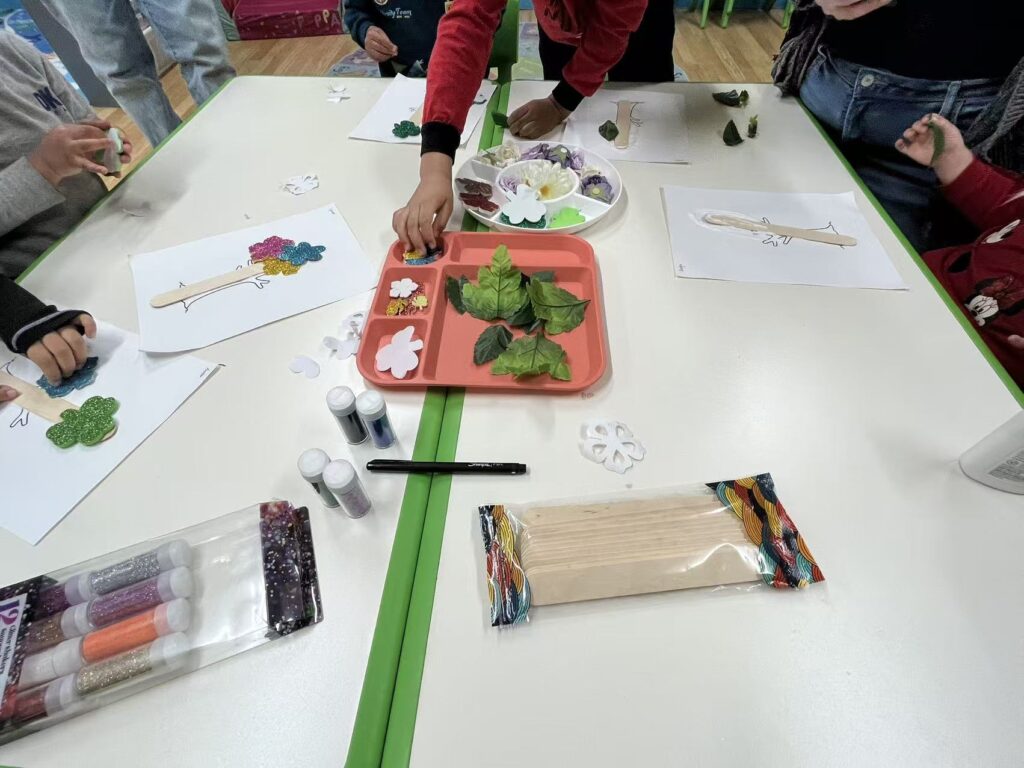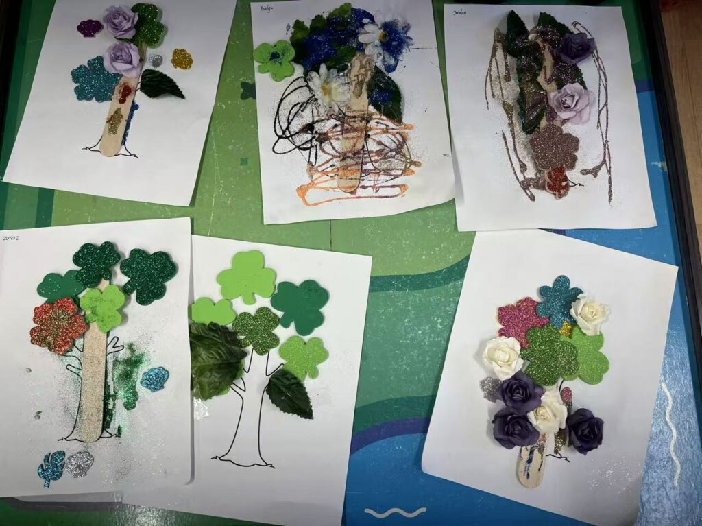 After hearing more of the children’s descriptions about trees, I reconsidered the materials I had originally prepared. I realized that my initial materials still reflected my own assumptions: leaves, wooden pieces, and green flowers, which resembled what I personally thought of as trees. However, the strong trees imagined by the children were not just green, natural, and ordinary. They described them as beautiful, eye-catching, rich, and special, suggesting that they were giving the trees more visual and emotional meaning.