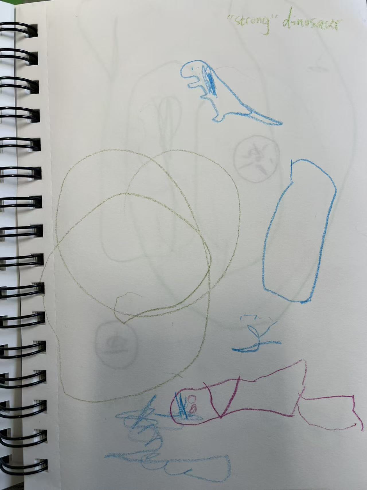 Through observation and conversation, I noticed that children frequently used the concept of “strong” during dinosaur play. I brought this idea into the drawing ritual and asked, “What makes a dinosaur strong?” Children drew sharp teeth and explained that being taller means being stronger, that having a longer tail makes you stronger, and that humans are weaker because they are smaller. These responses showed me that children are constructing their own working theories in order to understand the world.